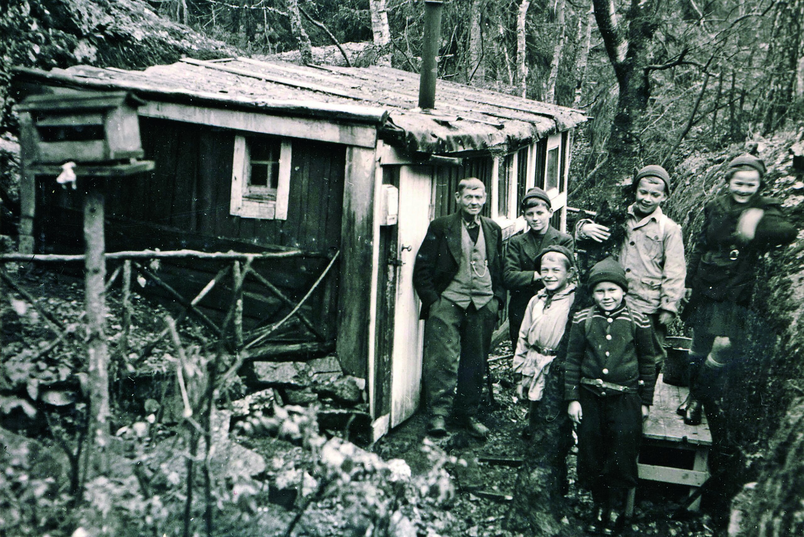 På besøk: Korpås-Olsen foran hytta si. Bildet er tatt av Erling Ingebretsen og det er fotografens sønn, Finn, som står nærmest Olsen. Bildet er tatt omkring 1949 og er det eneste kjente bildet av mannen.