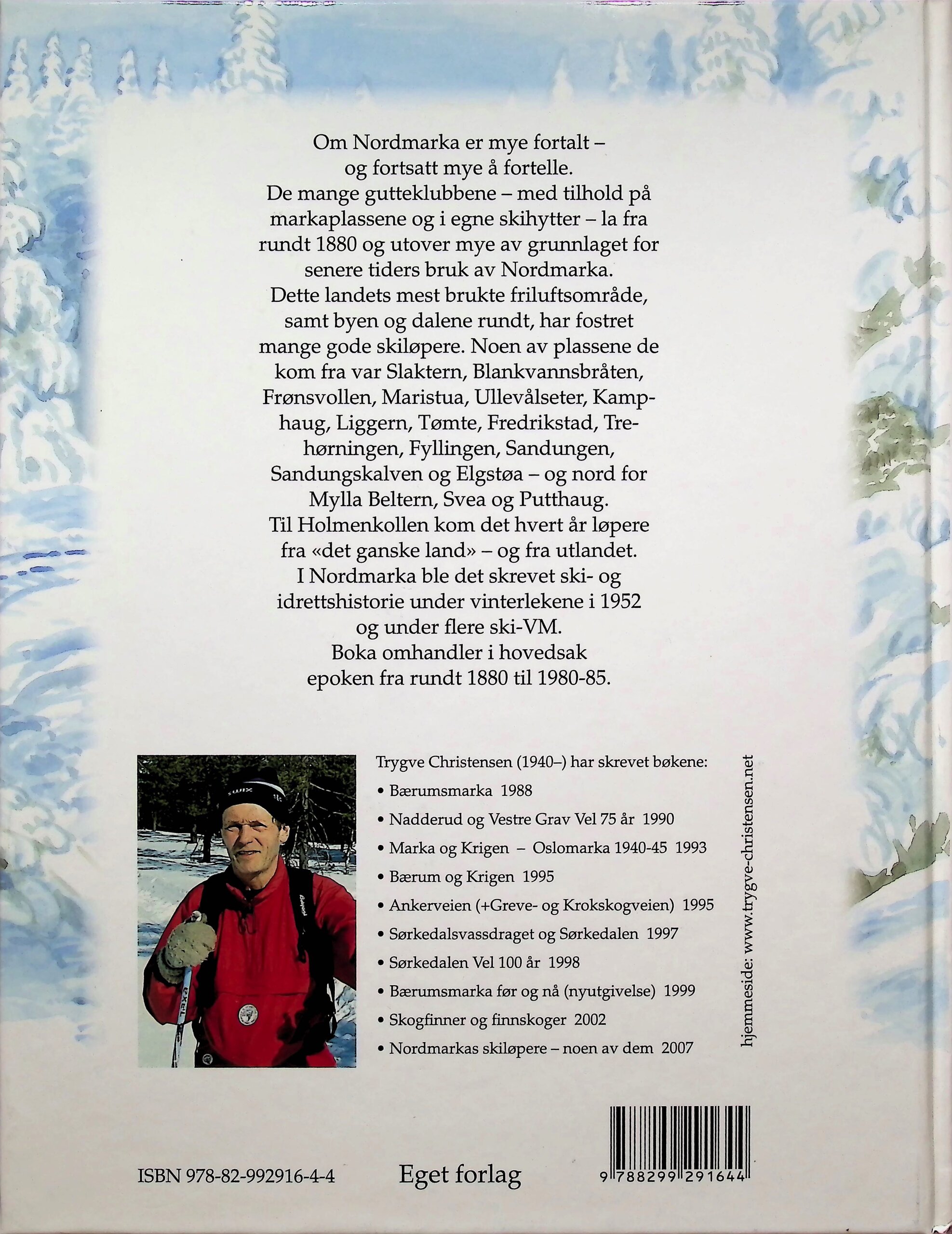 Trygve Christensen (1940) er forfatter, foredragsholder og lokalhistoriker. Han har skrevet en rekke bøker og artikler om Bærumsmarka og Nordmarka, og om Nordmarkas skiløpere. Han har også skrevet om Marka og 2. verdenskrig. Han er meget engasjert i arbeidet med å bevare friluftsområdene.